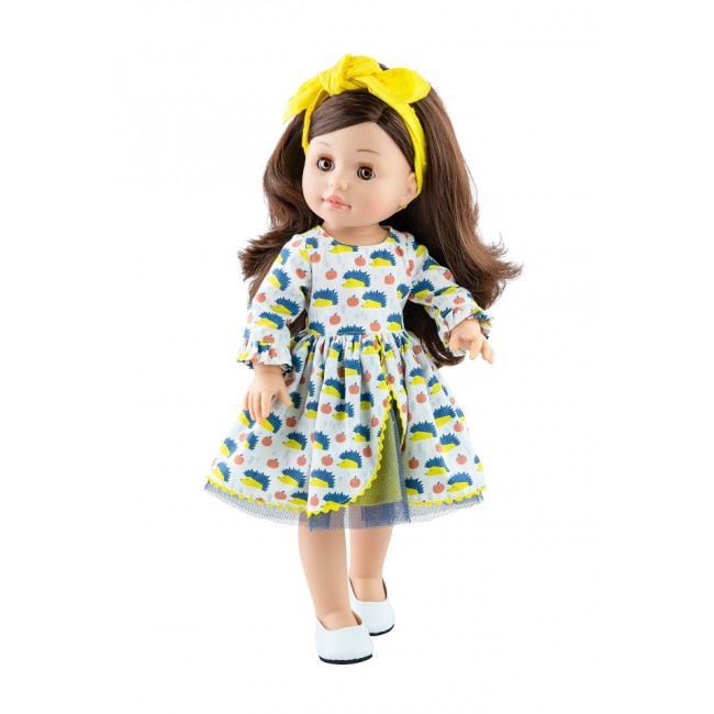 На ней одето нарядное платье с ежиками и яблочками, а ногах белые кожаные балетки.